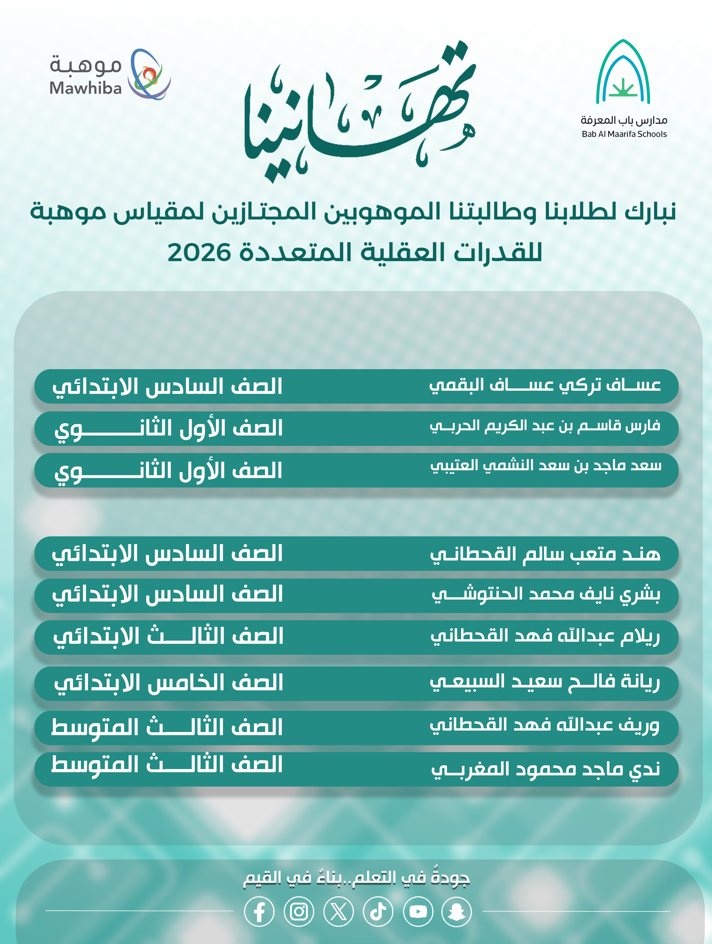 تقدّر مدارس باب المعرفة الأهلية ثقتكم الغالية باختياركم لنا كصرح تربوي يهدف إلى إعداد أبنائكم وبناتكم لمستقبل مشرق بإذن الله تعالى